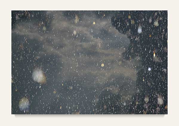 Fried captures strongly individual patterns of rainfall on large format color film. Rich chromatic variations are revealed by the prismatic effect of light passing through each individual raindrop, evoking a spacious cosmic look. His large-scale Rainscape photographs exude a quiet replenishing quality that unloads poetically within the viewer.